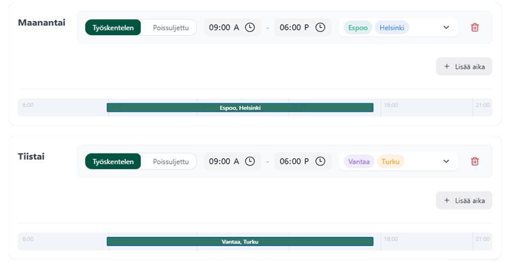 Voit määrittää eri alueita eri päiville, jolloin varauksia ei sallita kohdealueiden ulkopuolelle. Tämä mahdollistaa maksimaalisen ajanhallinnan.