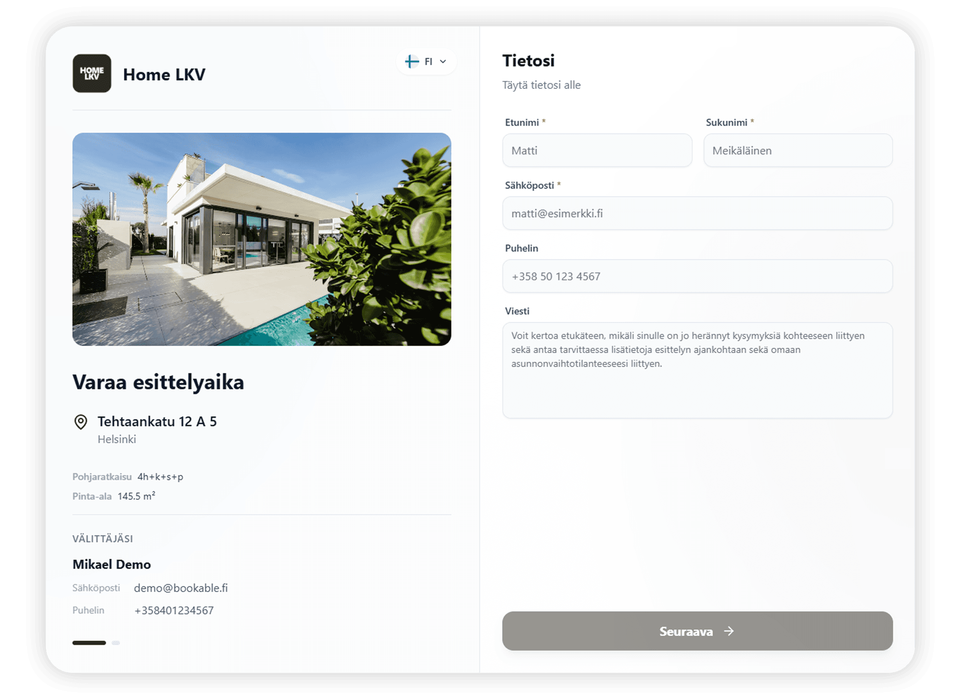 Automaattinen ajanvaraus ja liidien hallinta kiinteistönvälittäjille. Lunasta ilmainen kokeilujakso alta.